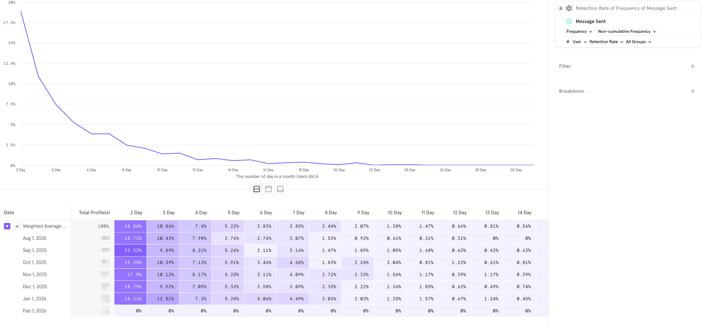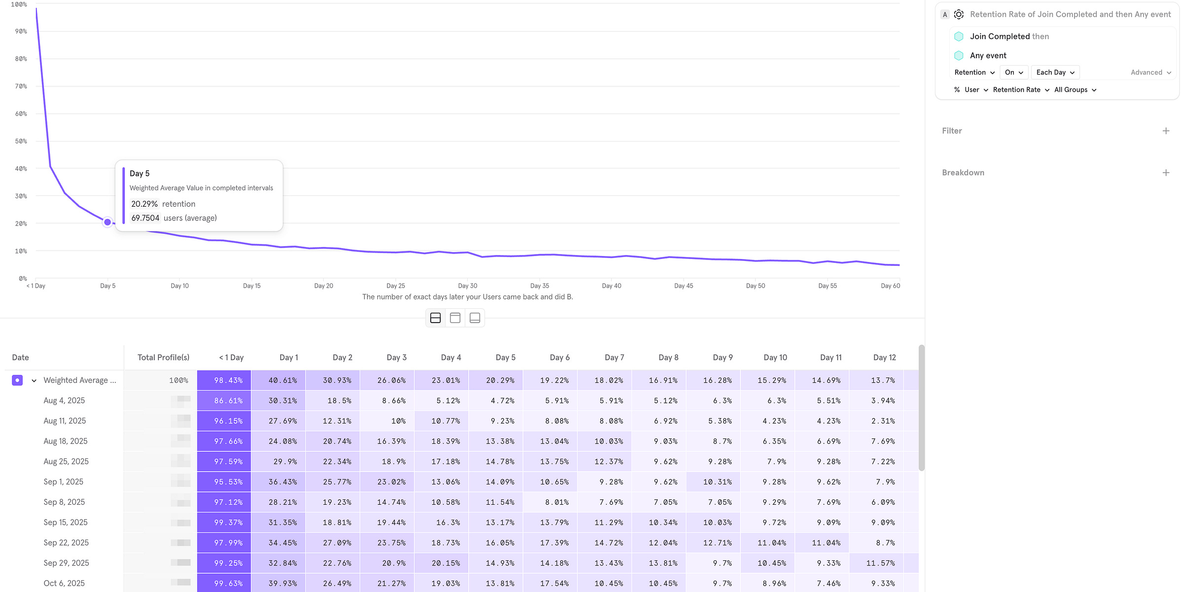 Weighted Average: The top row (purple) summarizes the average performance across all the weeks listed below. In this example, the Weighted Average for Day 1 is 40.61%. This means that out of everyone who signed up in this period, roughly 40% opened the app again the next day.